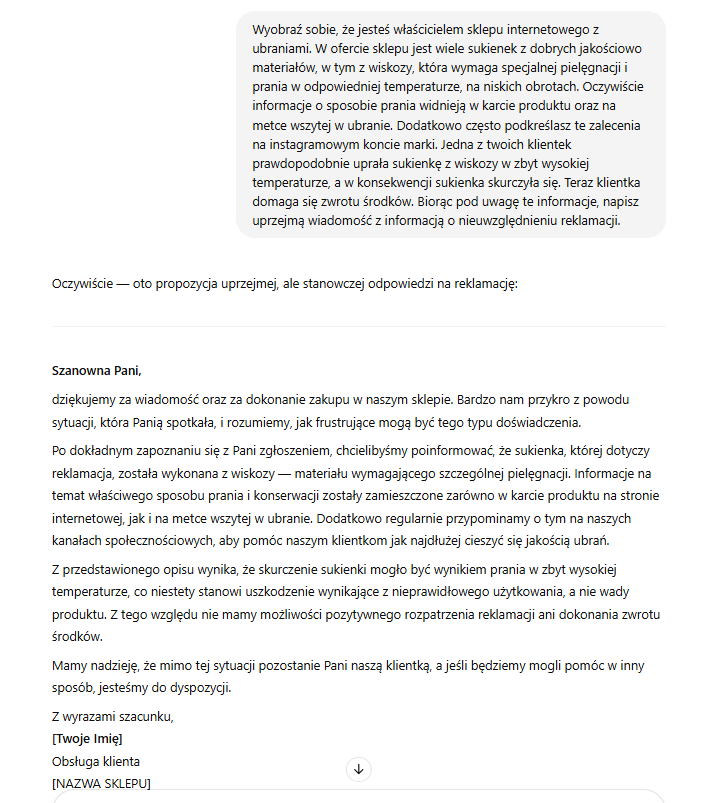 Trzeba przyznać, że w tym zadaniu ChatGPT poradził sobie całkiem dobrze – taka odpowiedź może z powodzeniem służyć jako schemat postępowania w przypadku podobnych reklamacji. W większych e-commerce’ach może być również wykorzystana jako element automatyzacji obsługi klienta.