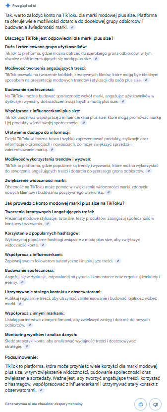 Trzymając się pomysłu na markę modową plus size, wpisujemy do okna wyszukiwarki przykładowe pytanie i dostajemy odpowiedź wraz z wnioskiem i linkami do źródeł: