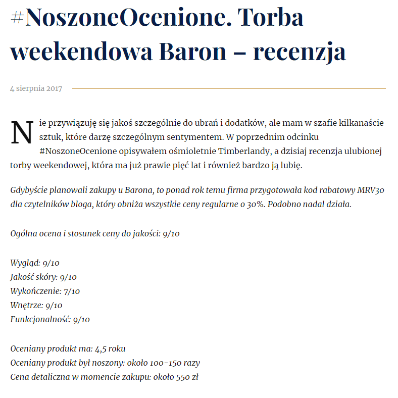 Szczególnie w przypadku produktów luksusowych z branży modowej, klienci często poszukują opinii rzeczoznawców. O ponadczasowej estetyce i wysokiej jakości toreb naszego Klienta, Marki ADAM BARON, pisał uznany bloger, Michał Kędziora. Modą męską zajmuje się od lat, a jego blog MrVintage.pl uchodzi za jeden z najbardziej opiniotwórczych i rzetelnych.