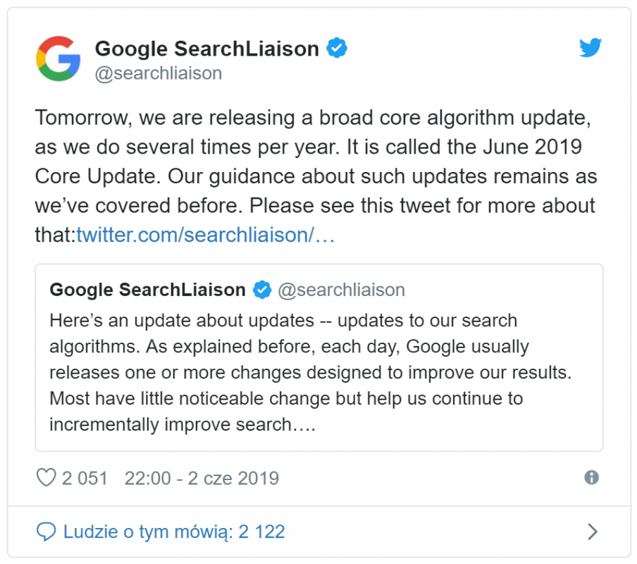 Google, w trosce o swoich odbiorców, nawet kilkaset razy do roku aktualizuje algorytmy odpowiadające za wyniki wyszukiwania. W większości są to niewielkie zmiany, jednak kilka razy w roku SEO-wcy muszą zmierzyć się z dużymi update’ami, o których zresztą do tej pory dowiadywali się po fakcie. W tym roku, po raz pierwszy, Google oficjalnie poinformował na swoim koncie na Twitterze o większej aktualizacji: