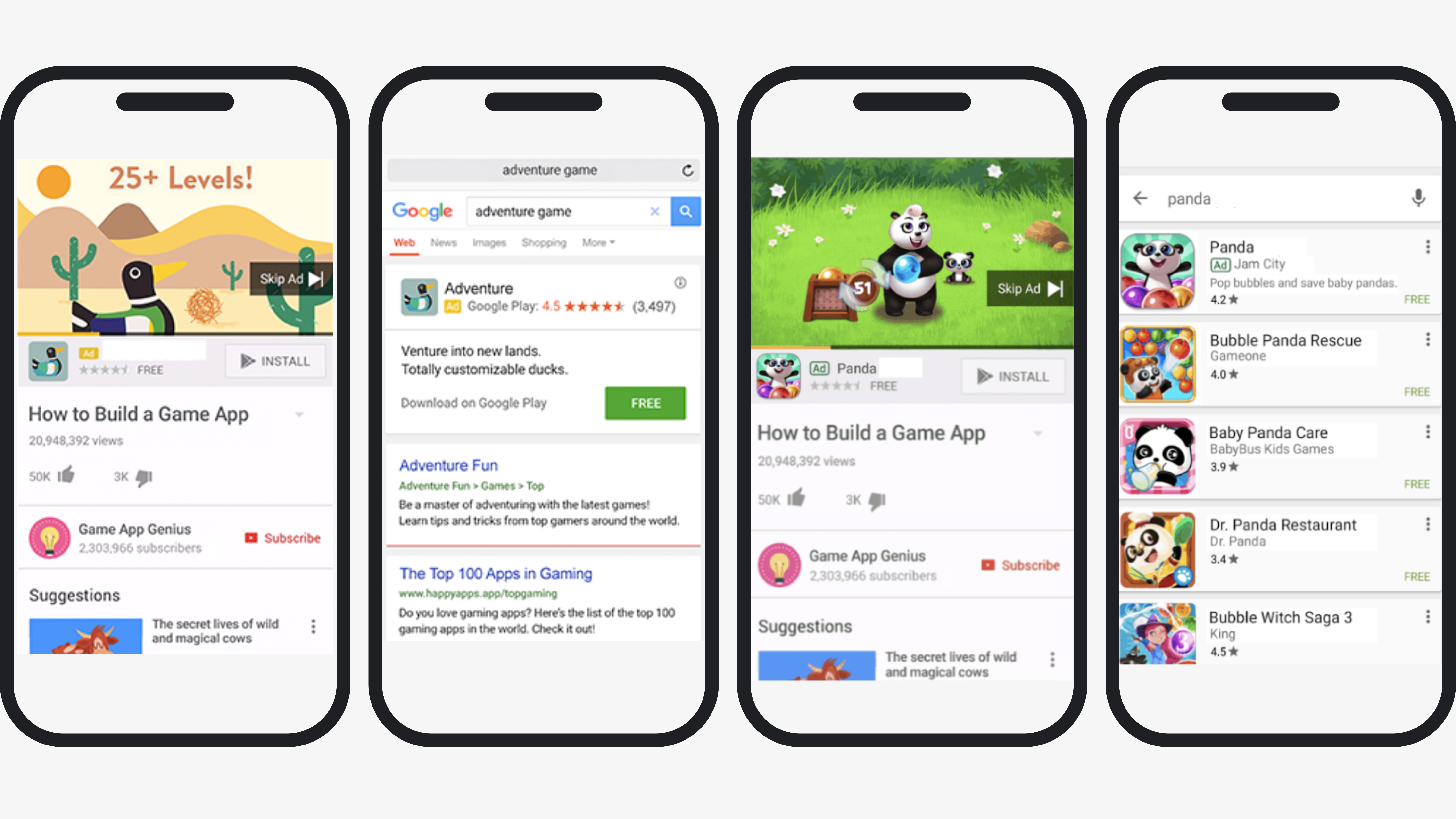 - Google Play Store – użytkownicy trafiają na reklamę w wynikach wyszukiwania w Sklepie Play, na stronie głównej oraz na stronach aplikacji.