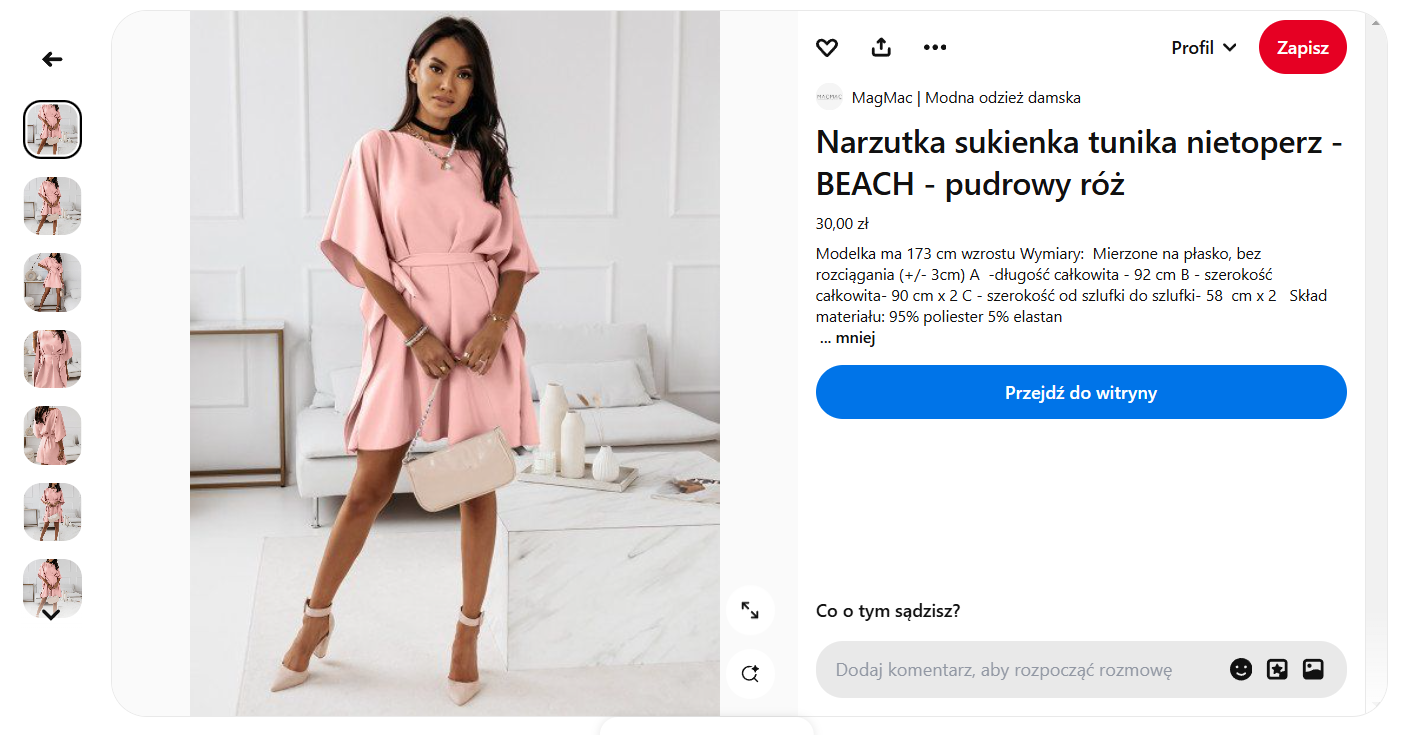 - Łatwe przejście na stronę finalizacji zakupu – użytkownicy mogą kliknąć w piny, które przekierowują ich na stronę, gdzie mogą finalizować zakupy. Dzięki temu Pinterest pełni rolę kanału, który znacząco skraca ścieżkę zakupową konsumenta.