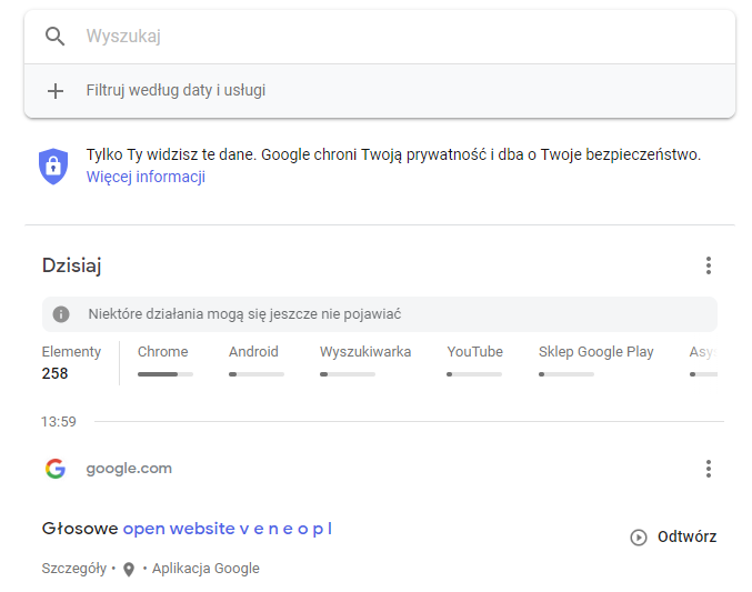 Jeżeli na swoim koncie Google posiadasz włączoną historię wyszukiwania – w usłudze „Moja aktywność”, znajdującej się pod adresem: https://myactivity.google.com/myactivity możesz sprawdzić nie tylko ostatnio wyszukiwane przez Ciebie hasła, ale i aktywność związaną z systemem Android, a nawet wyszukiwaniem głosowym w Asystencie Google:
