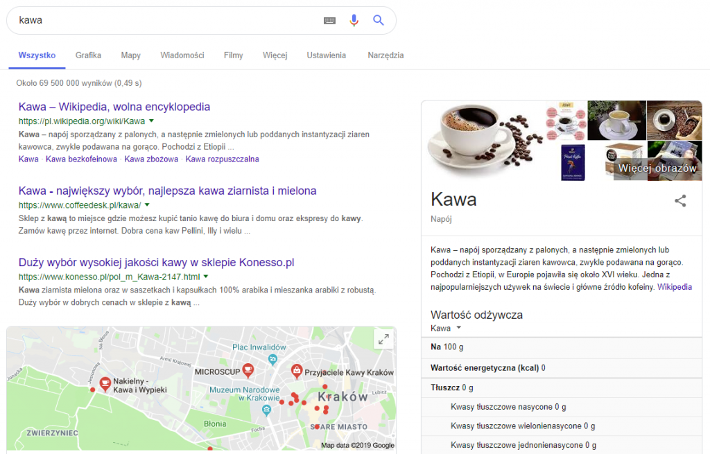 Załóżmy, że masz ochotę na aromatyczną kawę, ale nie znasz żadnej kawiarni w pobliżu. Wpisujesz zatem w wyszukiwarkę hasło „kawa”:
