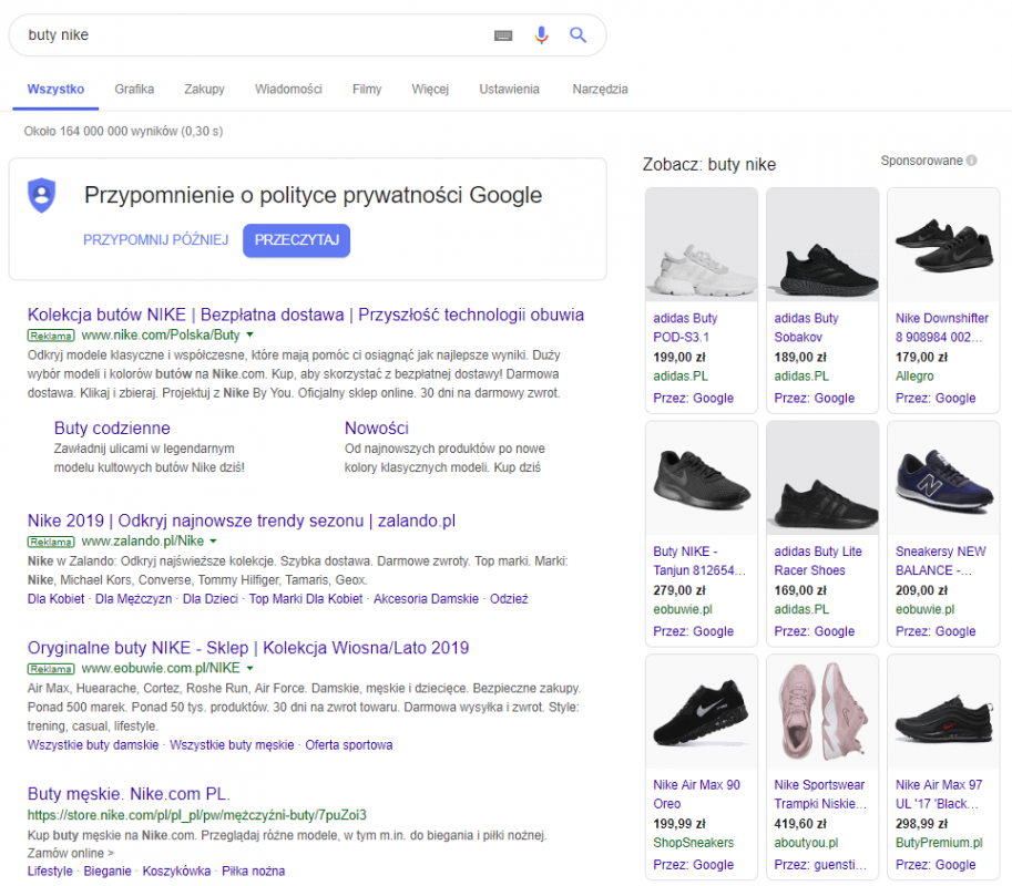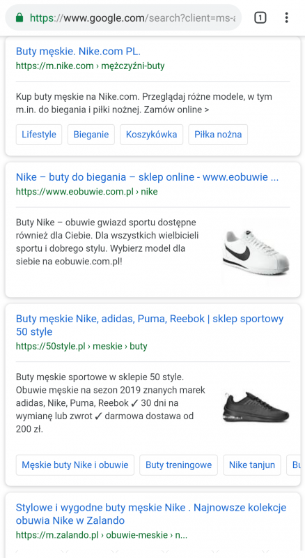 Posłużmy się ponownie przykładem garderoby – po wyszukaniu na urządzeniu mobilnym frazy „buty nike” zwracane wyniki różnią się zdecydowanie od tych z urządzeń desktopowych: