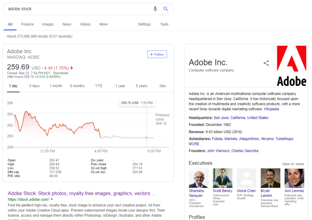 Po odwiedzeniu kilku adresów URL związanych bezpośrednio z notowaniami giełdowymi spółki Adobe i ponownej próbie wyszukania hasła „adobe stock” w Google – wyszukiwarka poprawnie zrozumie Twoją intencję i zaprezentuje cenę akcji spółki bezpośrednio w jej wynikach – w tzw. fragmentach rozszerzonych (ang. rich snippets):