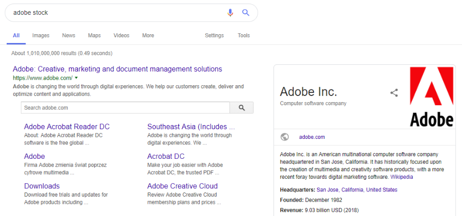 Google nie zrozumiało intencji wyszukiwania i pokazało jedynie informację o usłudze Adobe Stock. Należy zwrócić w tym momencie uwagę na wieloznaczność słowa „stock” w języku angielskim, które może dotyczyć zarówno „magazynu zdjęć”, „stanu magazynowego” jak i „akcji giełdowych”.