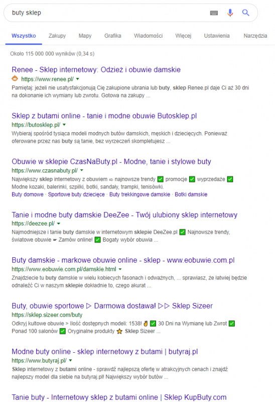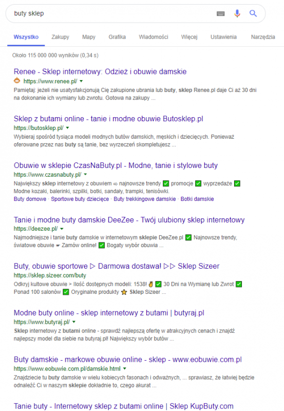 W moim przypadku – wyniki wyszukiwania wyglądają nieco inaczej, niż w przypadku koleżanki obok na to samo zapytanie. Wynik z domeny eobuwie.com znajduje się wyżej na jej liście. Wyszukiwarka rozpoznała, iż używając sformułowania „buty sklep” może być dla niej bardziej istotny wynik związany z butami damskimi, dlatego wyświetliła go na wyższej pozycji: