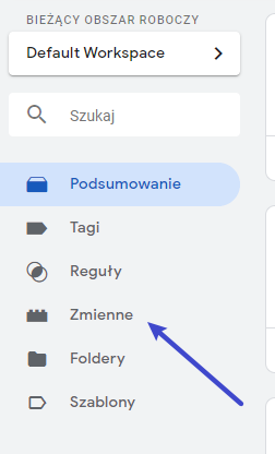 Następnie, mając kod Google Analytics, musimy zrobić z niego zmienną wbudowaną w GTM. Należy wybrać z menu bocznego pozycje „Zmienne” oraz dodać nową zmienną.
