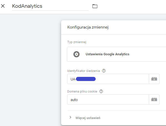 Jako typ zmiennej wybieramy Ustawienia Google Analytics i w polu „Identyfikator śledzenia” wklejamy wcześniej sprawdzony identyfikator Google Analytics.