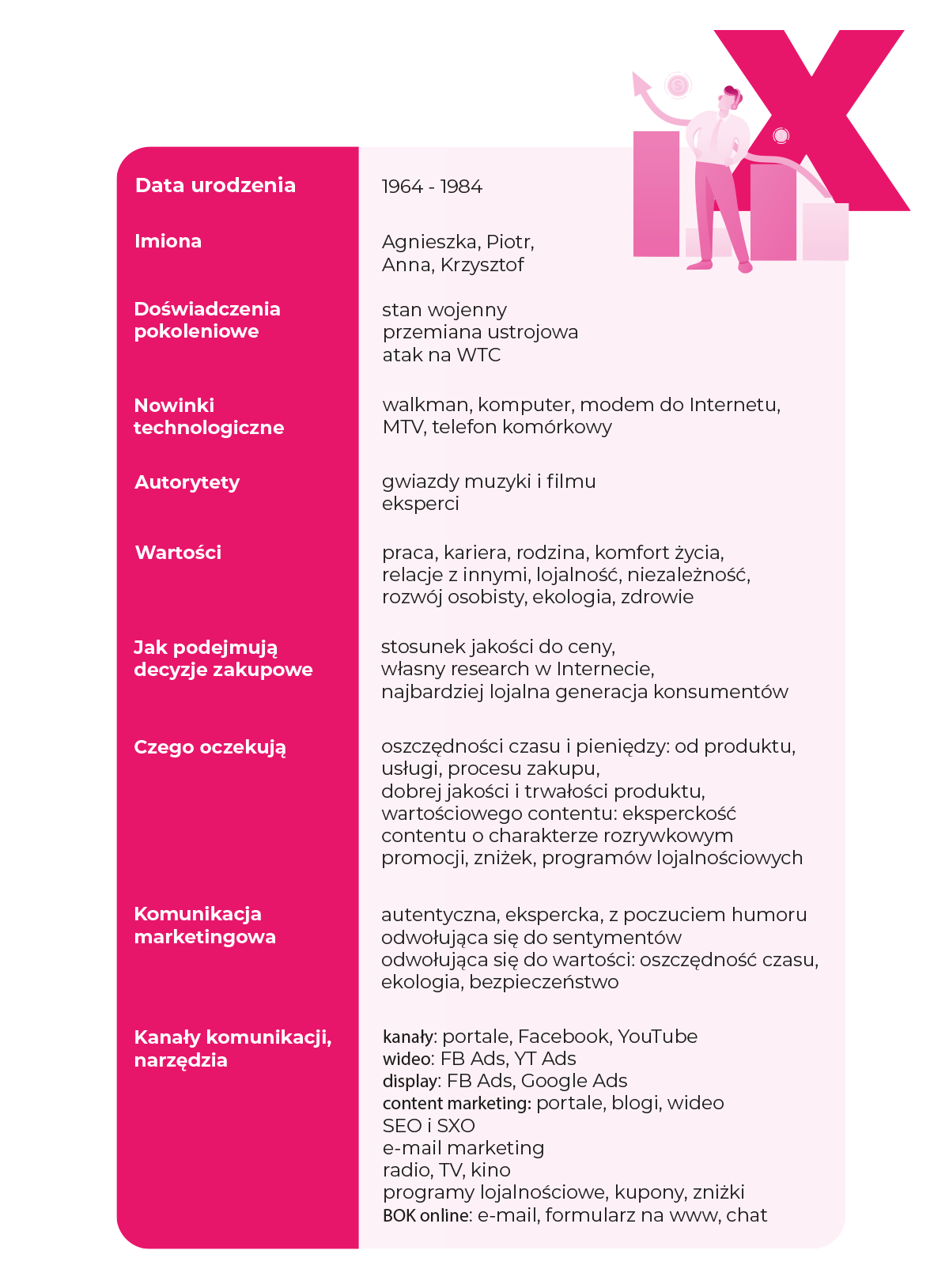 Pokolenie X weszło w dorosłość w latach 90., w momencie, gdy w Polsce dynamicznie rozwijał się marketing i reklama. Dzisiejsi czterdziesto- i pięćdziesięciolatkowie to osoby aktywne zawodowo, często mocno związane z miejscem pracy i rodziną. Pracodawcy opisują ich jako lojalnych, odpowiedzialnych i rzetelnych. Wysoko cenią stabilizację, ale równocześnie potrafią elastycznie reagować na zmieniające się realia – wielokrotnie doświadczyli bowiem zmian społecznych i gospodarczych.