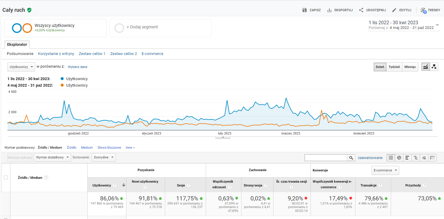 - wzrost liczby sesji o 117,75% w stosunku do poprzedniego okresu