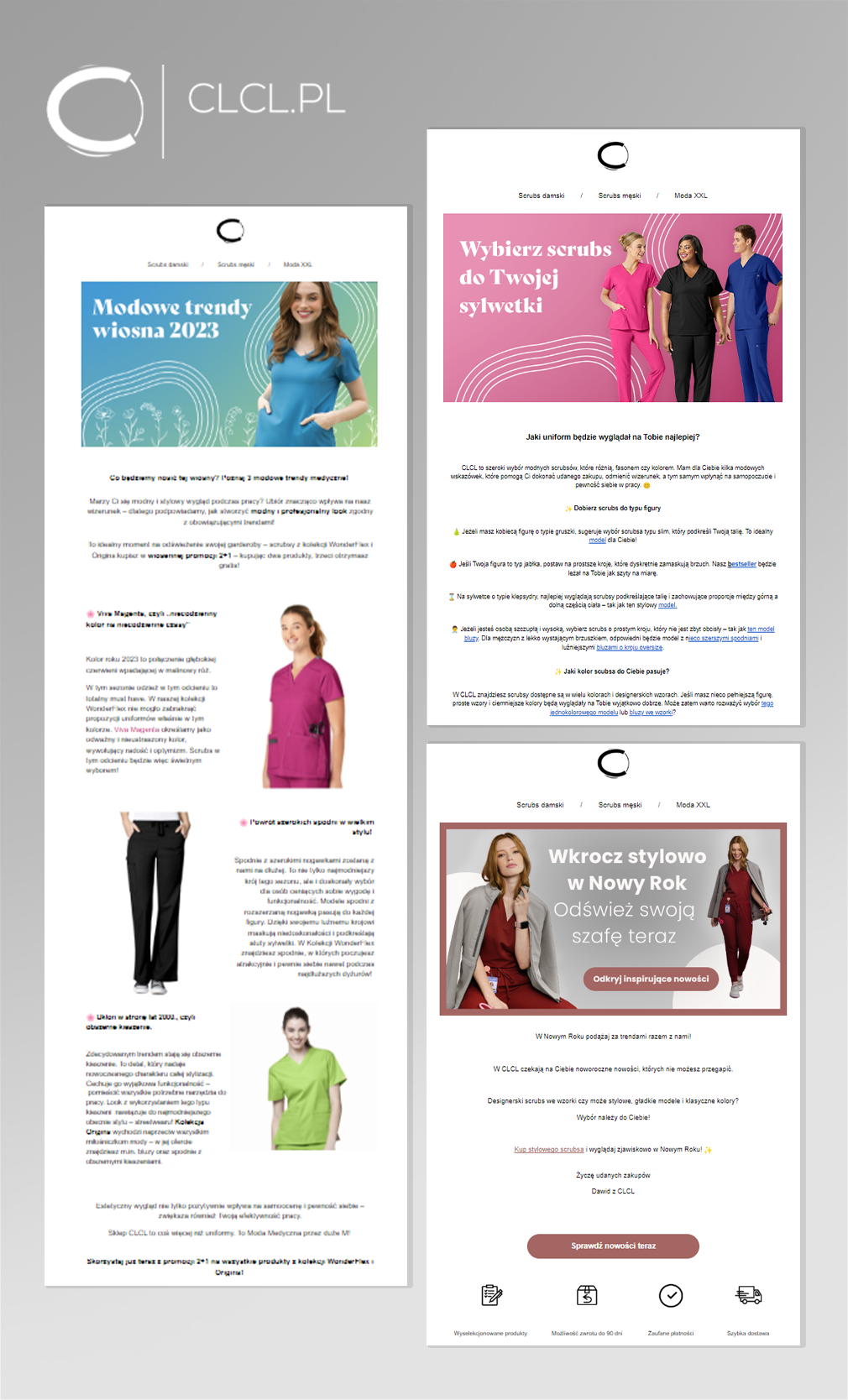 W pierwszej kolejności wspólnie z klientem ustaliliśmy pozycjonowanie marki. Choć stylowe uniformy CLCL nie są asortymentem typowym dla branży fashion, to tak właśnie komunikujemy scrubsy i inne elementy odzieży medycznej. Taki kierunek komunikacji okazał się strzałem w 10 – koniec z nudnym wizerunkiem w pracy!
