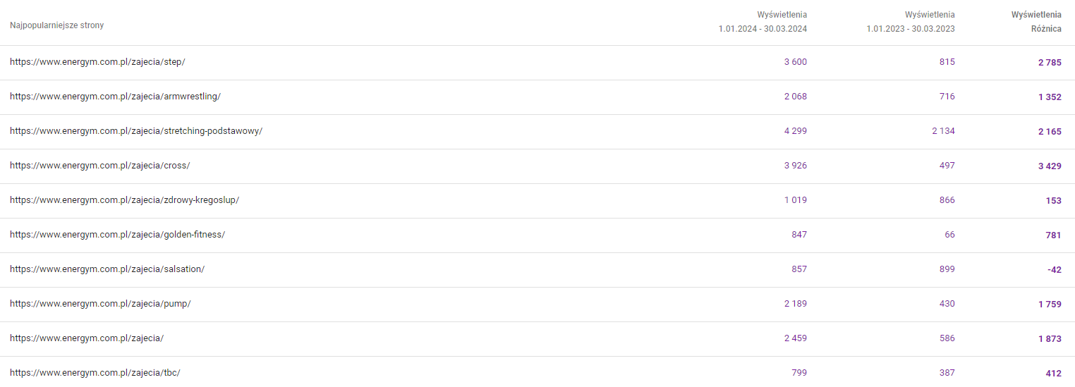W celu zwiększenia widoczności podstron prezentujących zajęcia organizowane na siłowni Energym, w ostatnim roku rozbudowaliśmy ich opisy, a także zoptymalizowaliśmy meta tagi oraz zdjęcia.