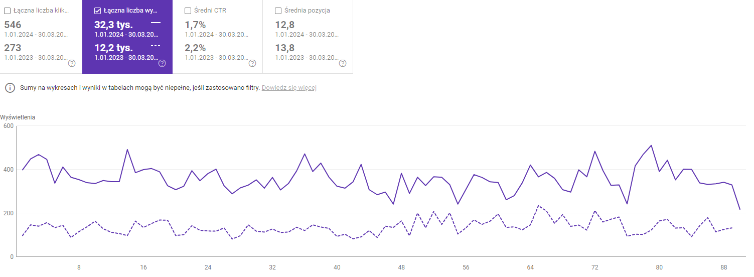 Znaczącą różnicę widać również w łącznej liczbie wyświetleń podstron przedstawiających ofertę zajęć w pierwszym kwartale 2024 w porównaniu do pierwszego kwartału 2023: