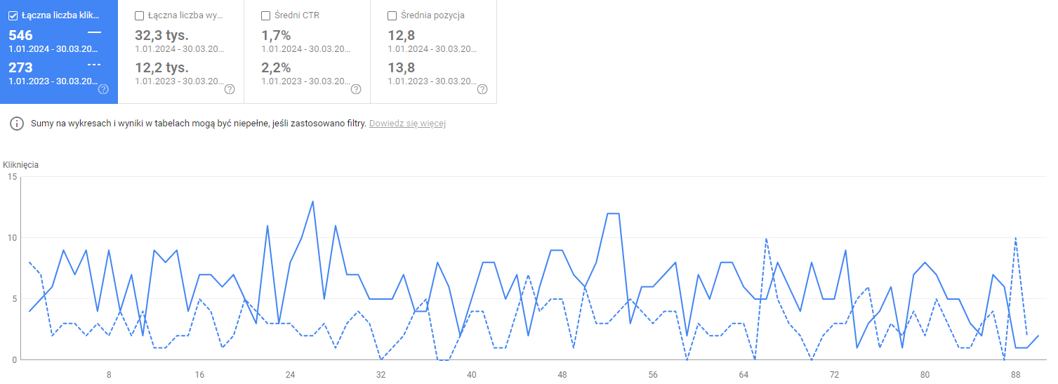 Warto również prześledzić jak kształtowała się łączna liczba kliknięć podstron przedstawiających ofertę zajęć w pierwszym kwartale 2024 w porównaniu do pierwszego kwartału 2023: