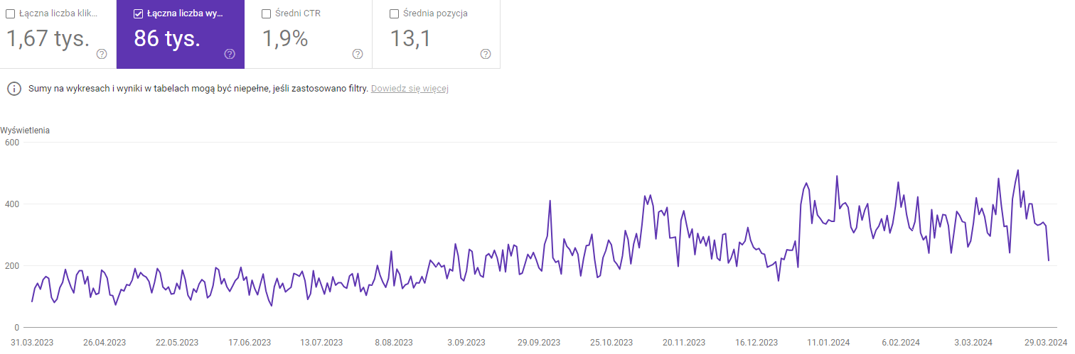 A tak rosła liczba wyświetleń serwisu dla wszystkich podstron przedstawiających ofertę zajęć na przestrzeni ostatnich 12 miesięcy (31.03.2023-31.03.2014):