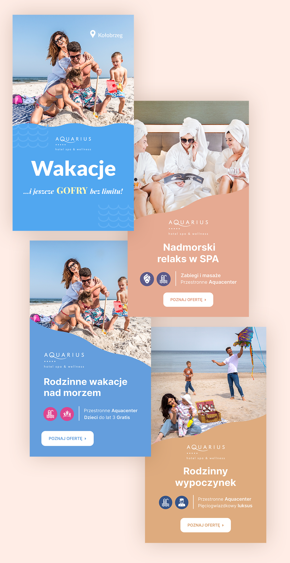 Materiały graficzne przygotowane zostały przez Klienta, w oparciu o wytyczne z naszej strony. Tutaj pomocne było nasze doświadczenie oraz dane historyczne odnośnie skuteczności materiałów reklamowych w pozostałych kampaniach prowadzonych dla hotelu AQUARIUS SPA *****.