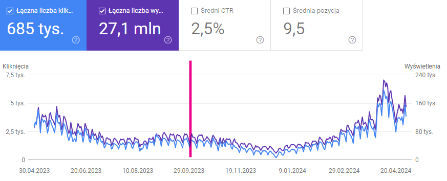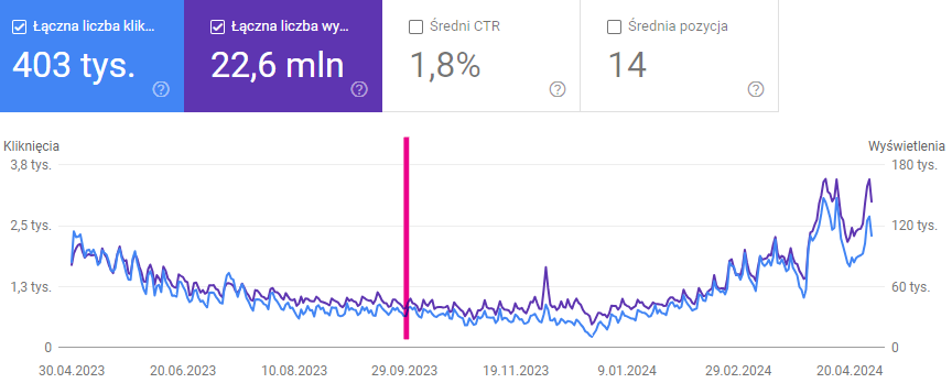 Łączna liczba kliknięć i wyświetleń w wyszukiwarce Google (30.04.2023 – 30.04.2024)