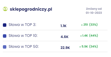 Udało nam się znacznie zwiększyć ilość fraz, na które wyświetla się strona SklepOgrodniczy.pl: 33% więcej w TOP 3, 44% w TOP 10 oraz 34% więcej w TOP 50!