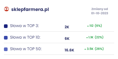 W przypadku serwisu SklepFarmera.pl osiągnęliśmy następujące wzrosty widoczności: 6% więcej w TOP 3, 22% w TOP 10 oraz 26% więcej w TOP 50!