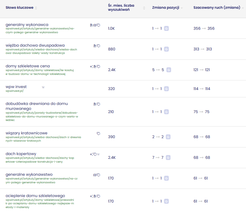 Pozycje wybranych słów kluczowych z monitoringu pozycji: